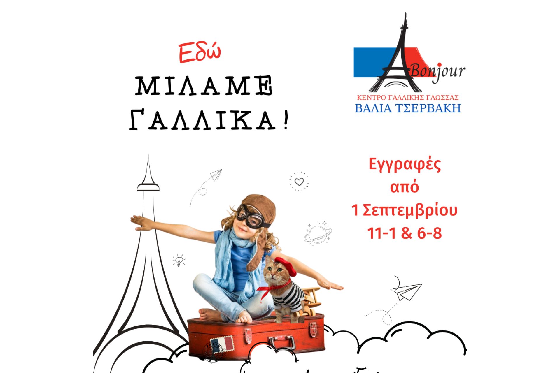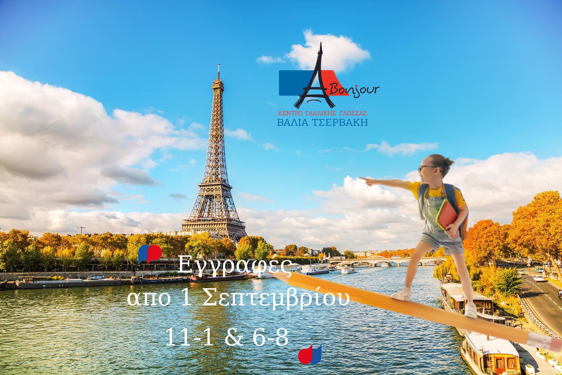 Μαθήματα γαλλικών για παιδιά, εφήβους, φοιτητές και ενήλικες. Εγγραφές από 1η Σεπτεμβρίου 11-1 & 6-8 στο Κέντρο Γαλλικής Γλώσσας Bonjour Tservaki Valia, Επιμενίδου Μαρούλη 21, τηλ: 2831 501920